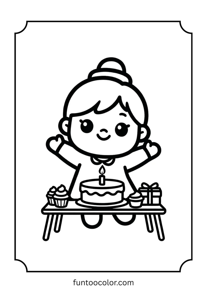 Girl standing beside of tiny birthday party table.